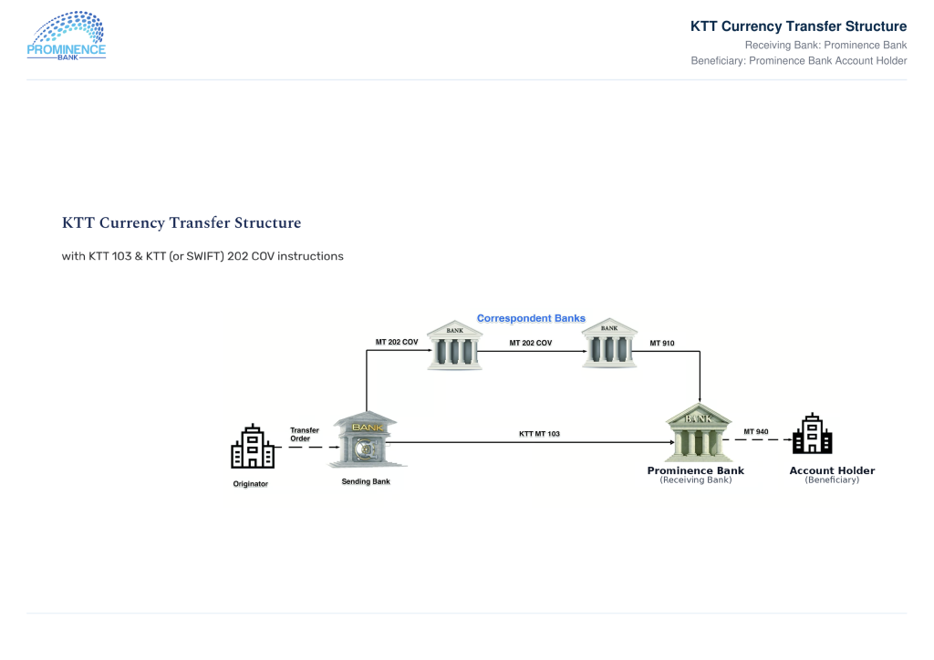 Prominence Bank accepts all types of financial transactions, including all forms of KTT (Key Tested Telex), from any financial institution worldwide. We do not restrict or block any sender bank, Telex code, jurisdiction, or transaction format. Additionally, we support and accept all procedures our clients may require for the successful execution of their transactions.